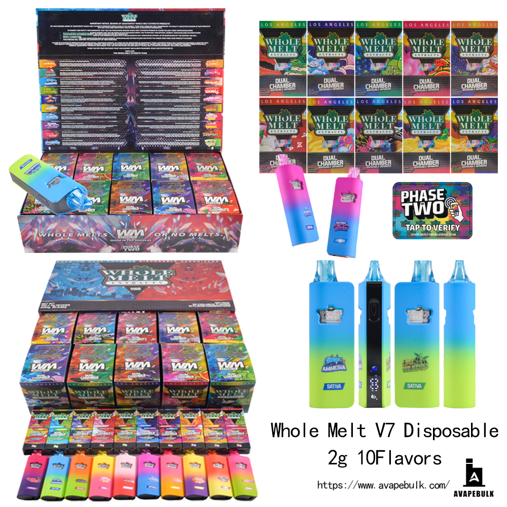 Our V7 Whole Melt products are empty hardware only—no oil, no nicotine, no THC. We offer Whole Melt V7 2g disposable shells and Whole Melt V7 dual chamber vape options in a consistent Whole Melt V7 disposable lineup, including Whole Melt V7 dispo variants and Whole Melt V7 flavors packaging/label styles for B2B sourcing.